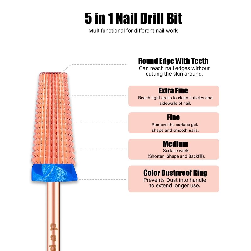 • 【5 in 1 Carbide Nail Drill Bits】Quantity: 1 pc | Color: Rose Gold | Grit: Medium | Shank Size: 3/32'' | Direction: Two-Way Rotation | User: Beginner, Experienced, Nail Tech, Salon, etc.