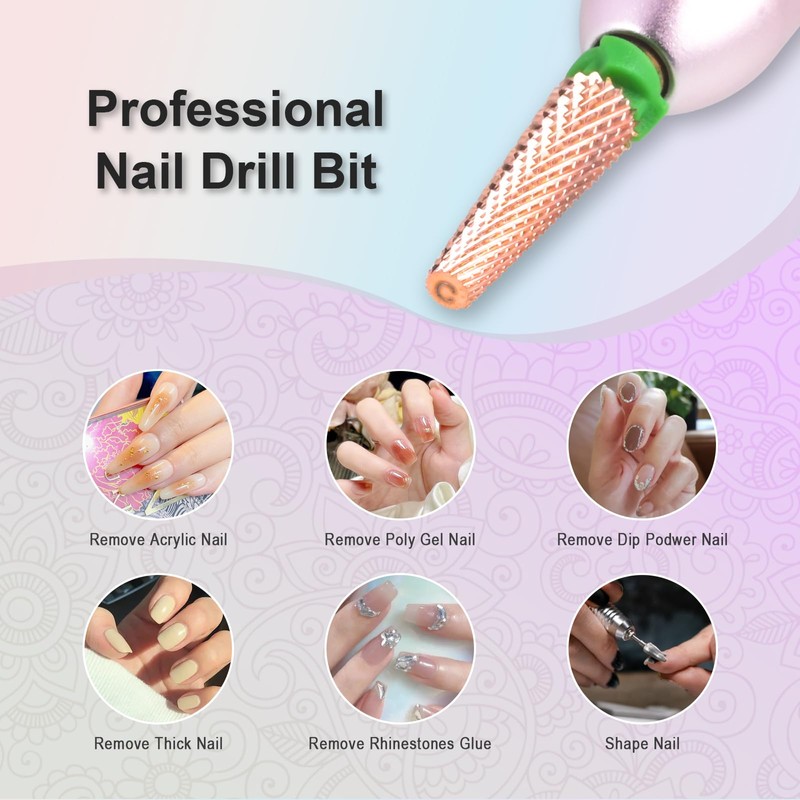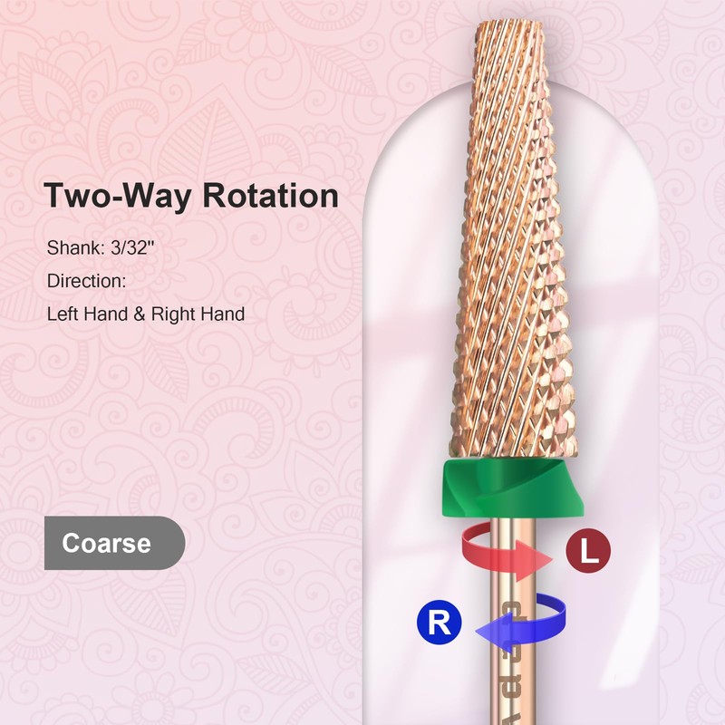 - 【5 in 1 Cross Cut Carbide Nail Drill Bits】Quantity: 1 pc | Color: Rose Gold | Grit: Coarse | Shank Size: 3/32'' | Direction: Two-Way Rotation | User: Beginner, Experienced, Nail Tech, Salon, etc