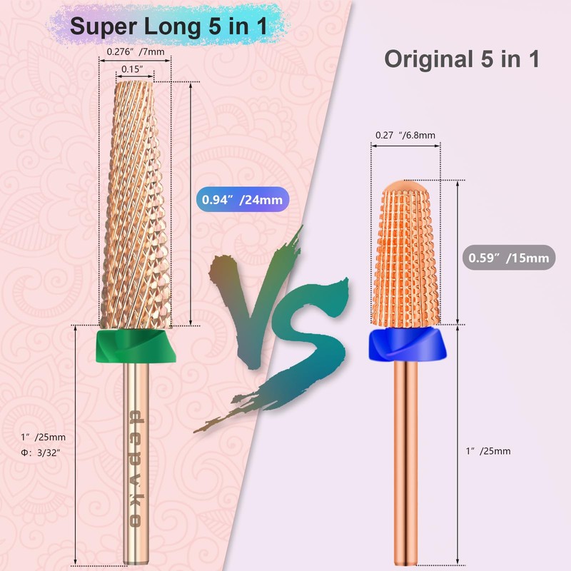 - 【Upgraded Super Long Design】The 5-in-1 nail drill bit is designed longer with a large contact area, which is faster and more convenient for removing & polishing acrylic nails than other bits. Extreme sharp teeth design allows you to remove acrylic nails, hard & thick nails, gel extensions, and dip powder with less pressure, making your nail removal a breeze. Especially for med, long, to 3XL nails, cutting down time on long sets. It's a top choice for long nails