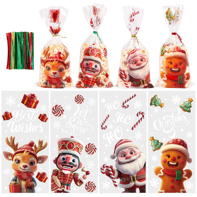 - Christmas Theme Pattern: These Christmas party cellophane favor bags are double-sided printed. These bags are designed with classic beautiful Christmas theme pattern: Santa Claus, elk, gingerbread man, snowflakes, etc. 3D pattern looks more delicate and special and add the festive atmosphere.