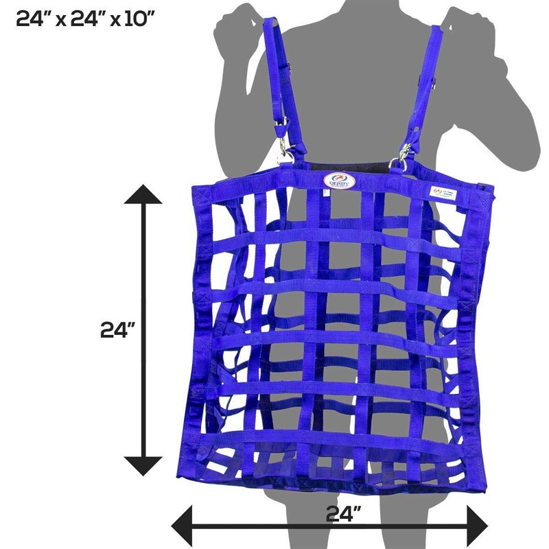 - HOLDS 2-3 FLAKES OF HAY - this 24x10x24" hay bag with 3.5x3” rectangular openings holds approx. 2-3 flakes of Timothy, Orchard, Alfalfa, or any other type of hay. Our hay bags were designed to minimize frustration and can be stuffed in seconds.