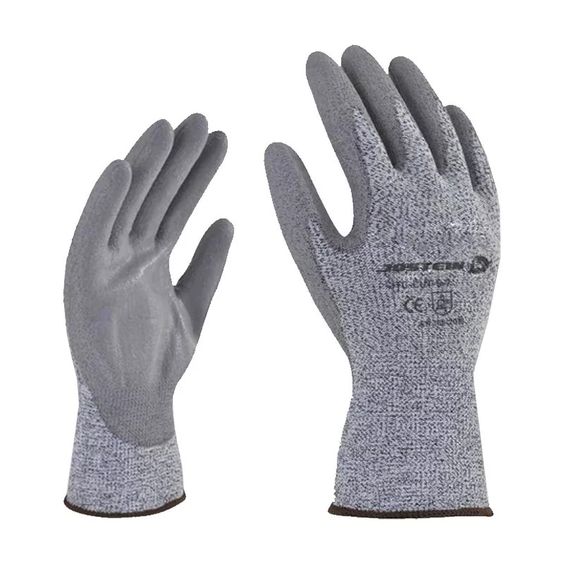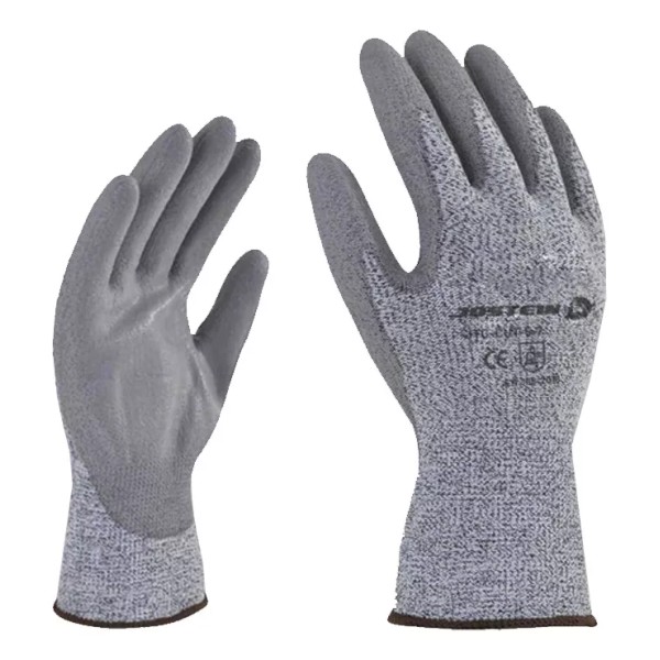 Guante anti corte de polietileno de alta densidad, fibra de vidrio e hilo de acero con poliuretano gris en palma y puño tejido de punto ribeteado con certificado ANS.