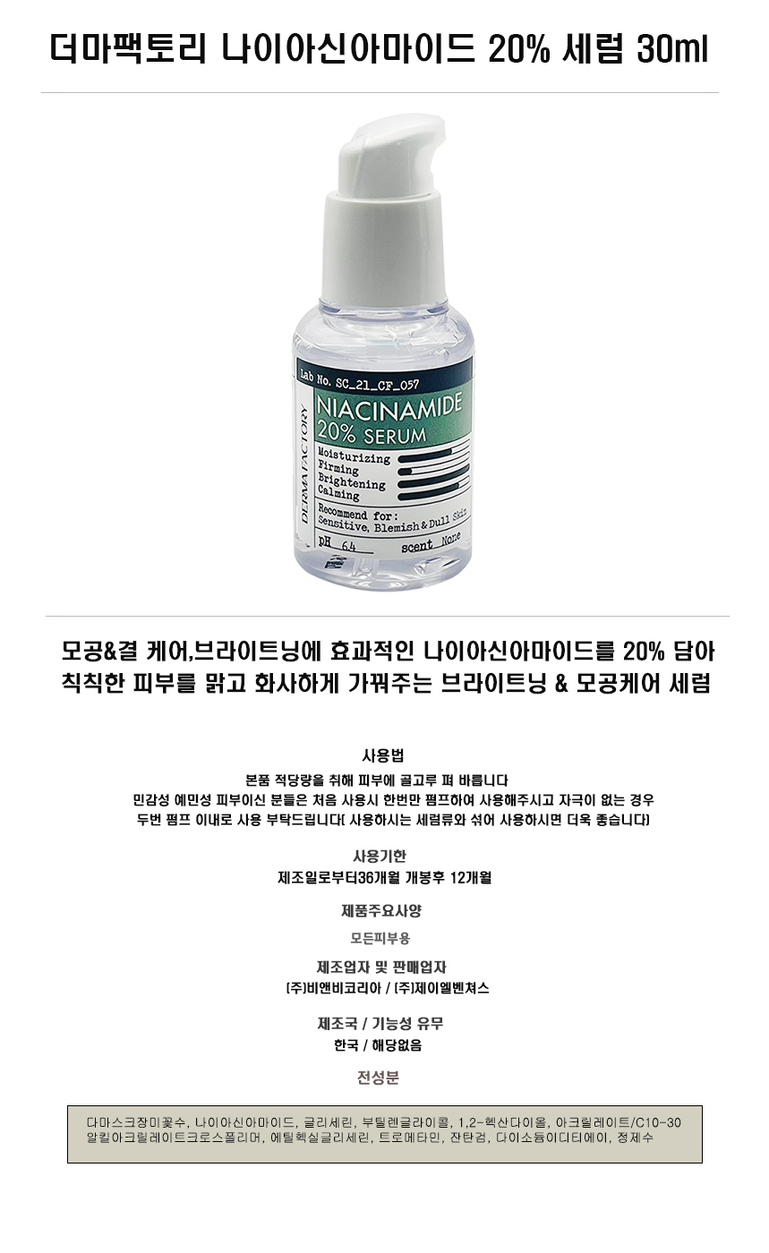 Derma Factory Niacinamide 20% Serum 30ml / 더마팩토리 나이아신아마이드 20% 세럼 30ml