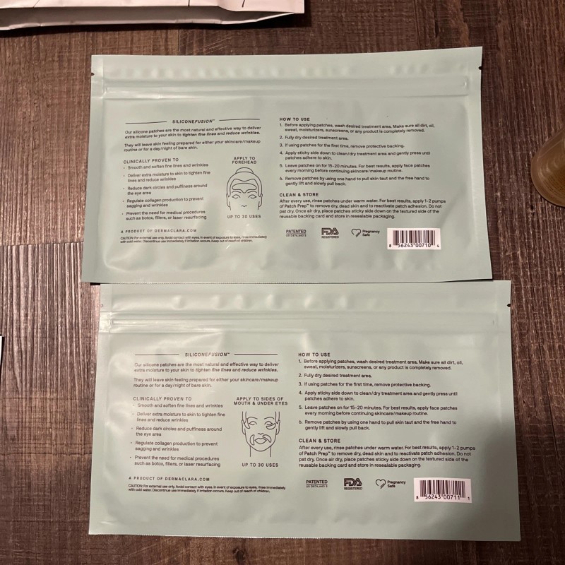 Includes one eyes and mouth, reusable silicone, patch, forehead, reusable silicone, patch, patch prep silicone patch activator 30 ML, lip serum peptide infused seven ML daily restorative oil all purpose miracle hydrator 30 ML all new and sealed