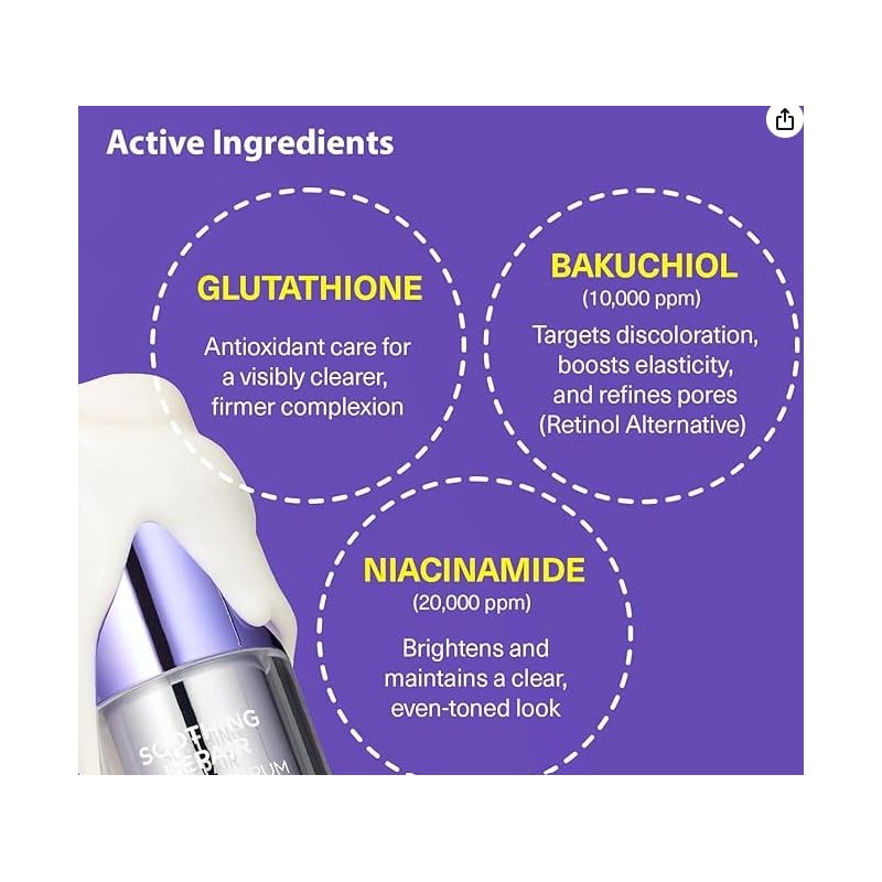 - POTENT RADIANCE BOOST: Packed with 20,000ppm of niacinamide and 10,000ppm of bakuchiol, collagen, peptides, this serum delivers intense hydration and skin-brightening benefits . These powerhouse ingredients work together to enhance skin elasticity and reveal a glowing complexion infused with Peptides, Vitamins, Glutathione.