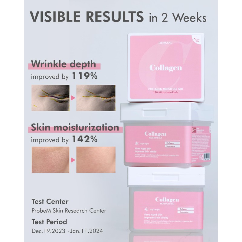 - ULTIMATE CARE KOREA: Discover the DERMAL Collagen Moistfull Pad, your Korean beauty solution for wrinkles, improved elasticity, and enhanced texture. With 10 types of collagen, this toner pad smooths lines and rejuvenates your skin. Simply apply, tap for absorption, and experience a younger, more supple complexion.