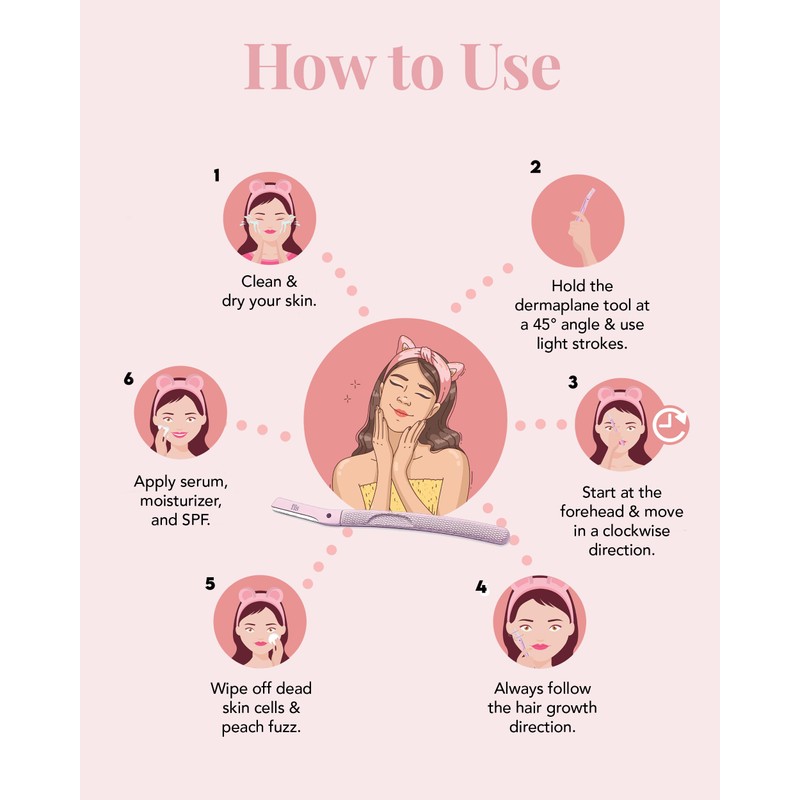 - No More Peach Fuzz: This dermaplaning facial razor for women features a specialised fine-angled blade that ensures gentle yet effective exfoliation and hair removal. With regular use of our dermaplaning tool, you can achieve smoother, more radiant skin— Fuss-Free!