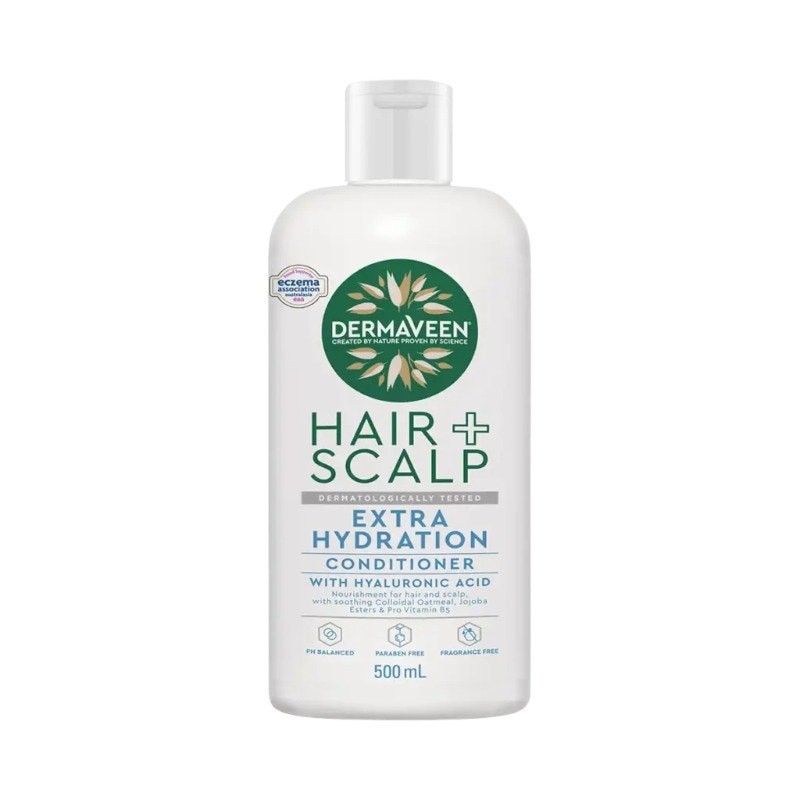 DermaVeen Hair + Scalp Extra Hydration Conditioner soothes sensitive scalps and hydrates dry hair, boosted with OatActiv+ (6 in 1 skin benefits) and hyaluronic acid. It’s the plus your hair and scalp needs.