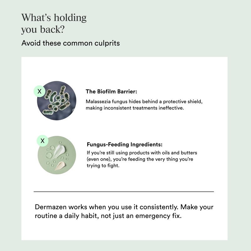 - There's a reason your manuka honey gel, ointment, and specialized shampoo isn't working - they aren't disrupting the biofilm (so they can't reach the skin aggrivator) and they use oils that feed the problem. Put an end to your seborrheic nightmare and gain peaceful skin and peace of mind with Dermazen.