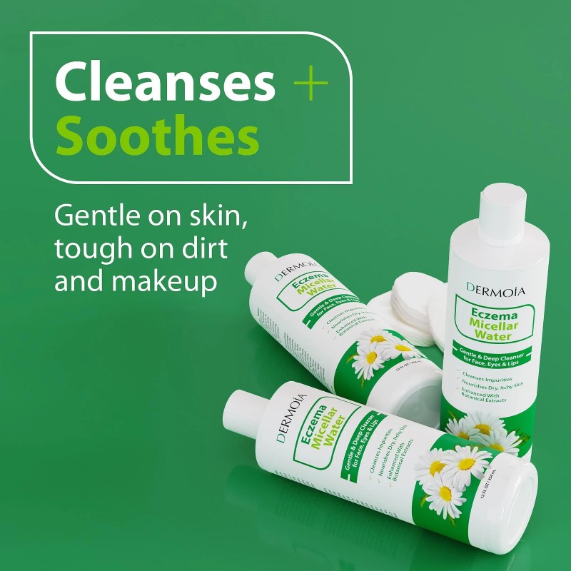 - ALL-IN-ONE ECZEMA MICELLAR WATER - DERMOIA Gentle Face Cleanser & Makeup Remover gently yet thoroughly removes deep-seated dirt, oil, & makeup while maintaining your skin’s moisture balance. This micellar cleansing water is a multi-action daily facial cleanser that refreshes & rejuvenates skin without harsh scrubbing.