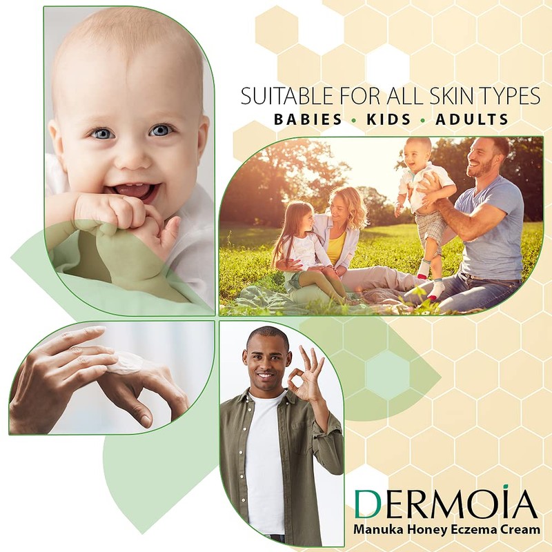 - NUTRIENT-ENRICHED RELIEF FROM ECZEMA - Dermoia Manuka Honey Eczema Cream is infused with skin-soothing botanical extracts that deliver nutrient-enriched relief from dry, cracked skin, itchiness, rashes, redness, & other skin discomforts associated with eczema. This manuka honey cream locks in moisture & forms a strong natural skin protective barrier.