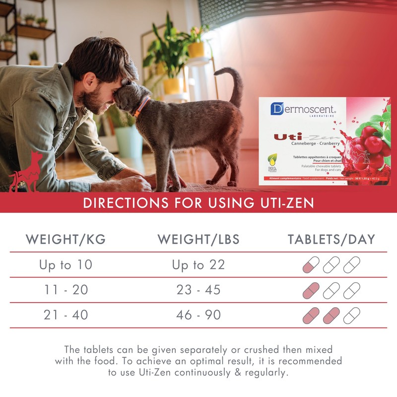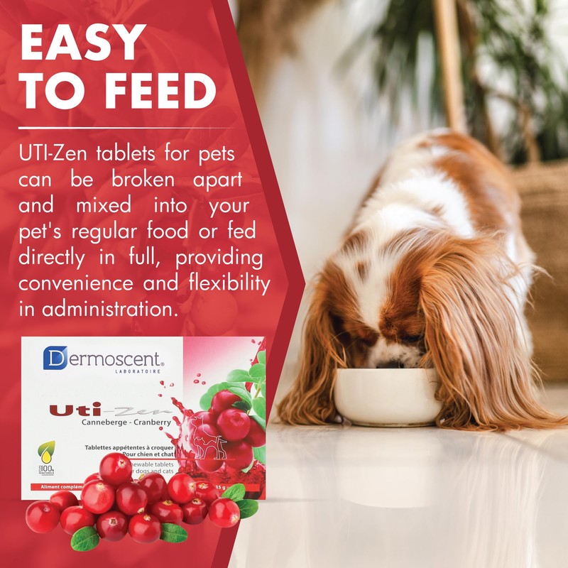 Dermoscent | Uti-Zen | Cranberry Tablets for Dogs & Cats | Food Supplement for Bladder, Kidney & Urinary Tract Health | Chicken Flavoured 30 Tablets