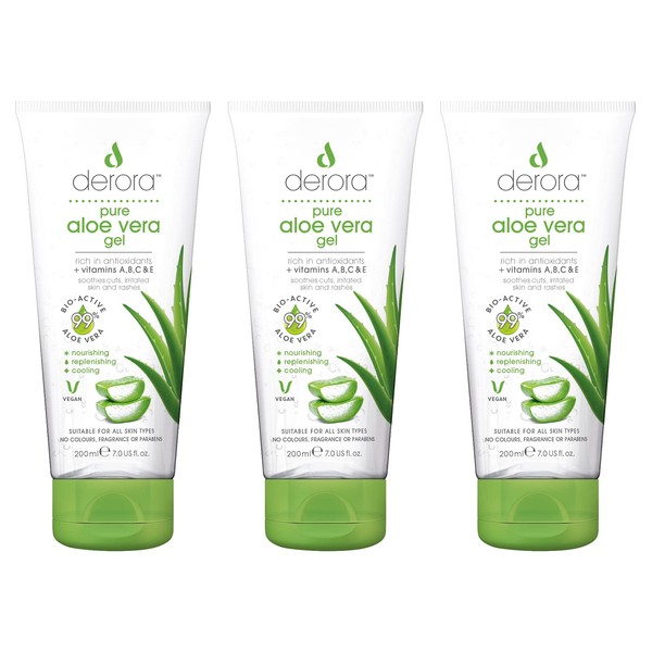 Derora Aloe Vera Gel, Contains 100% Pure and Natural Bioactive Aloe Ingredients for Healing, Soothing and Hydrating Skin, Face, Cruelty Free & Vegan, 200 ml (Pack of 3)