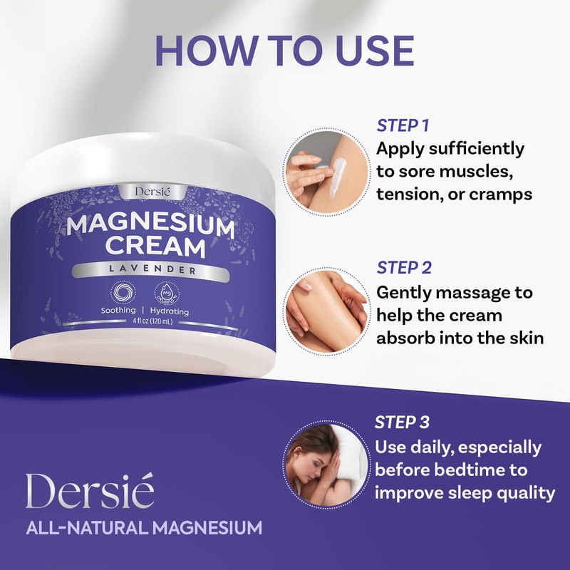 Dersie Magnesium Cream for Sleep & Leg Cramps: Soothing Magnesium Lotion with Lavender, Grape & Camellia Seed Oil - Hydrating & Calming for Men, Women and Kids (4 fl oz)