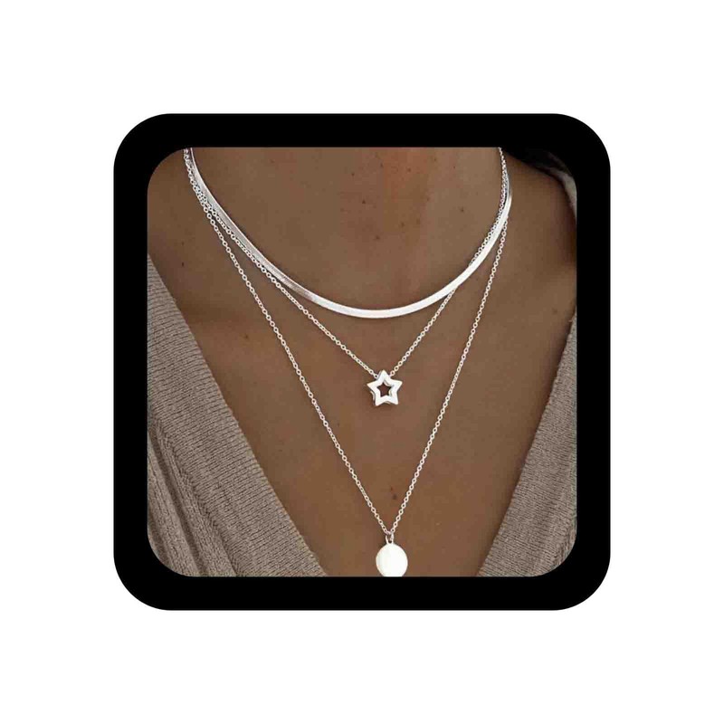 Dervivea Boho Layered Star Coin Necklace Silver Disc Pendant Necklace Hollow Star Choker Necklace Layering Herringbone Chain Necklace Jewellery for Women, Zinc, No Gemstone