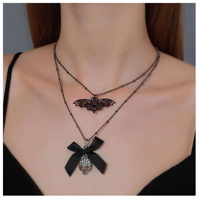 Dervivea Gothic Bow Pendant Necklace Choker Crystal Skull Choker Necklace Black Flying Bat Necklace Chain Vintage Layered Bat Skull Necklace