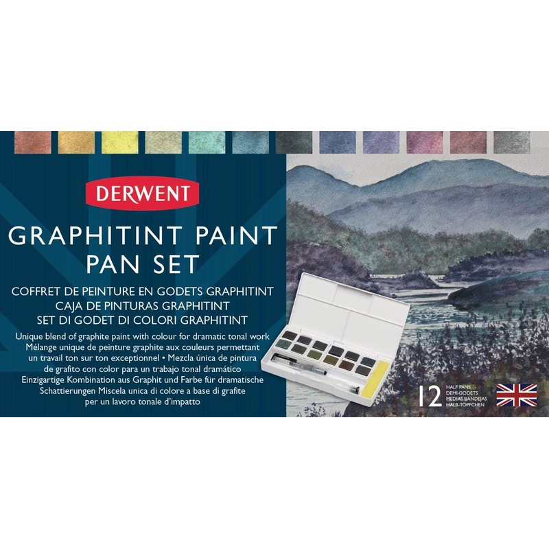 - Contents: 1 x Set of 12 Derwent Graphitint paints pans, a mini waterbush, a sponge and five mixing palettes