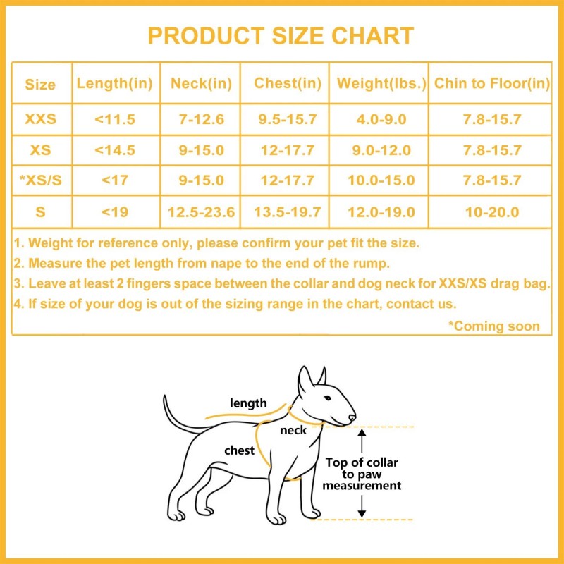SIX DIFFERENT SIZE - from XXS to L, various lengths and widths, adjustable neck webbing and nape webbing, you can always find a drag bag perfectly fit you pet