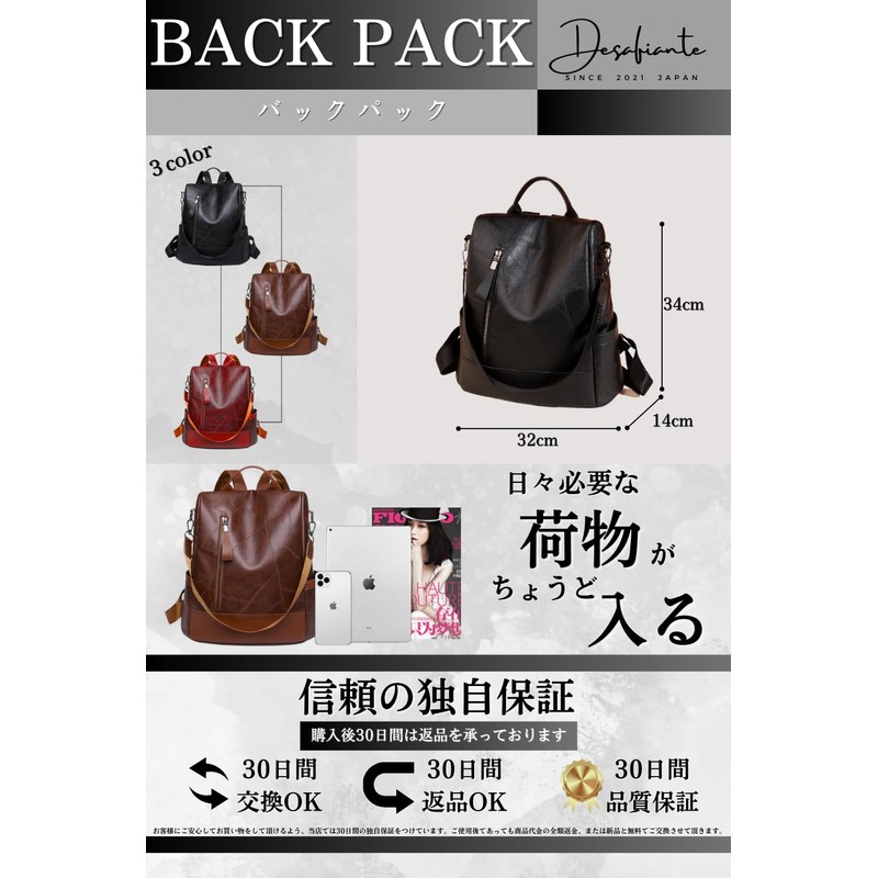 DESAFIANTE Women's Backpack, PU Leather, Waterproof, Lightweight, Anti-Theft, Back Zipper, Business Bag, Commuting to Work Bag, Rucksack, Fashionable, Casual, 3-Way Popular, Commuting to School,