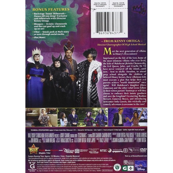 Meet the next generation of villains in Disney's DESCENDANTS! Imprisoned on the Isle of the Lost, home of the most infamous villains who ever lived, the kids of Maleficent (Kristen Chenoweth), the Evil Queen, Jafar and Cruella De Vil have never ventured off the island... until now. Sent to idyllic Auradon to attend prep school alongside the children of beloved Disney heroes, these villainous kids must execute a plan that helps their evil parents achieve "world domination" once again! Will Maleficent's daughter (Dove Cameron) and the other rebel teens follow in their rotten parents' footsteps or will they choose to embrace their innate goodness and save the kingdom? Co-starring Booboo Stewart, Cameron Boyce and introducing newcomer Sofia Carson, this wickedly cool comedy adventure is awesome to the core!