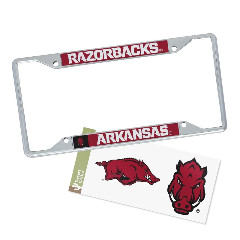 Desert Cactus University of Arkansas Car Accessories Metal License Plate Frame and Sticker for Front or Rear of Car (Sticker Frame Combo - Mascot)