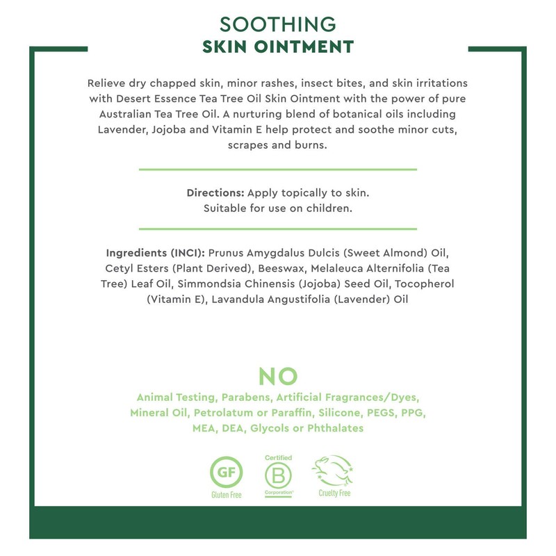 - SOOTHE & RELAX - Desert Essence's ointment for face and body contains soothing and relaxing lavender oil that provides aid in relieving unease, skin detoxification, and helping sunburns.