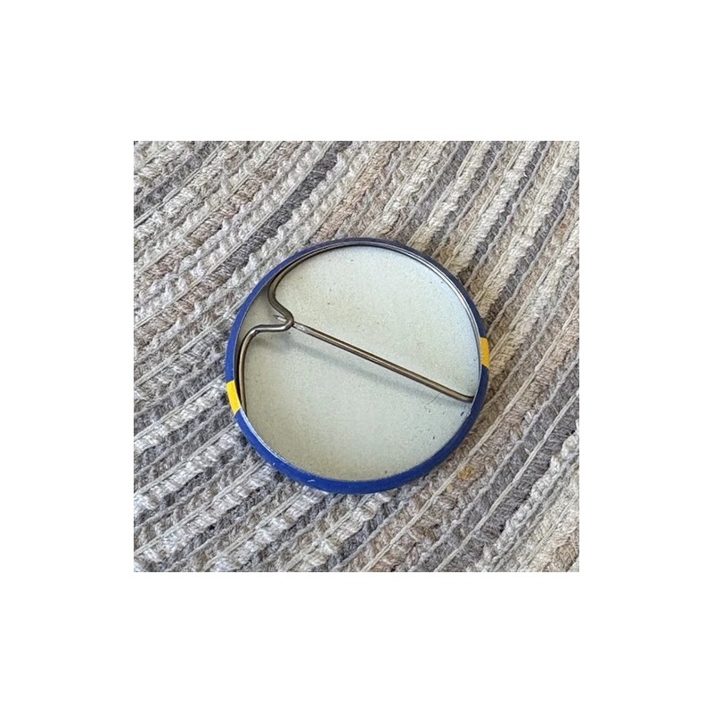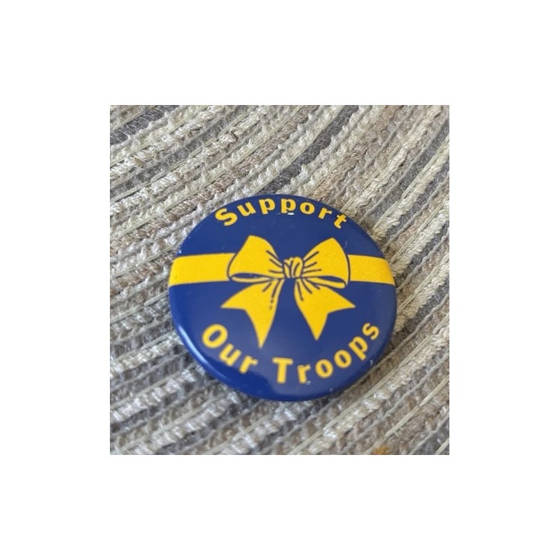 Vintage yellow ribbon pin button featuring a blue background, designed to show support for the troops during the Desert Storm conflict (1990)This collectible pinback is a patriotic symbol of solidarity and gratitude towards military personnel serving in the Gulf War. Please see photos as they are part of the description of this item.