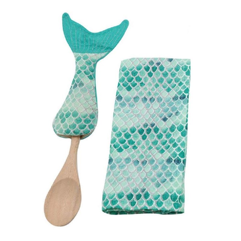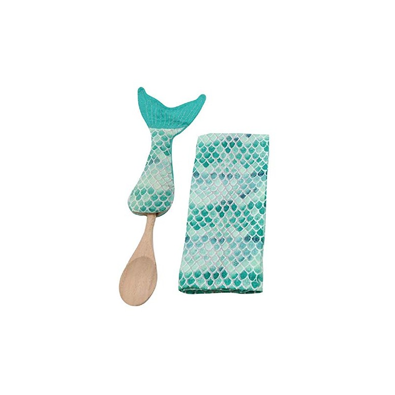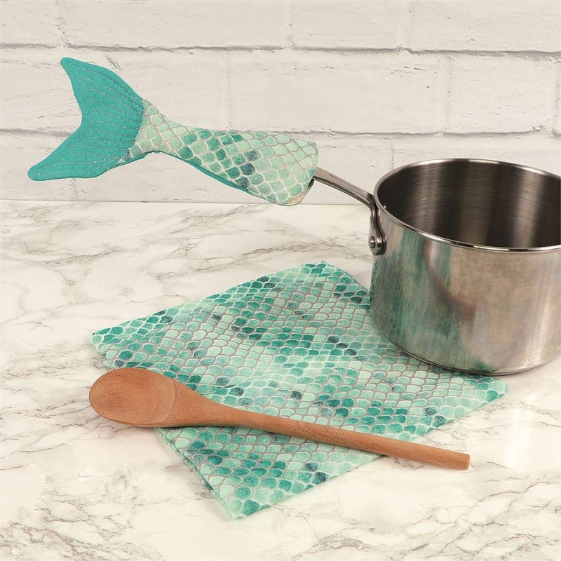Design Engineering DEI Mermaid Tail Dishtowel, Pan Handle Sleeve and Wooden Spoon 3 Piece Set (Green)