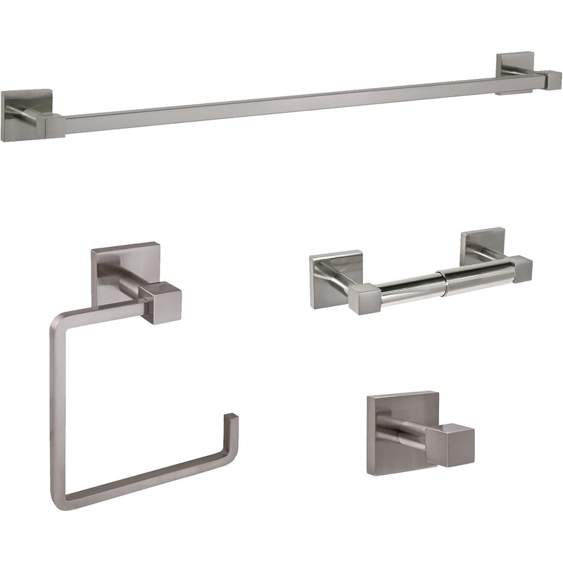 - Includes: 24" Towel bar, towel ring, toilet paper holder and robe hook