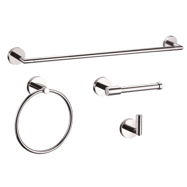 - Includes: 24" Towel bar, towel ring, toilet paper holder and robe hook