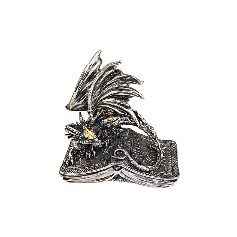 Design Toscano Pendragon Guarding the Codex Dragon Statue, Polyresin, Silver Chrome, 15 cm