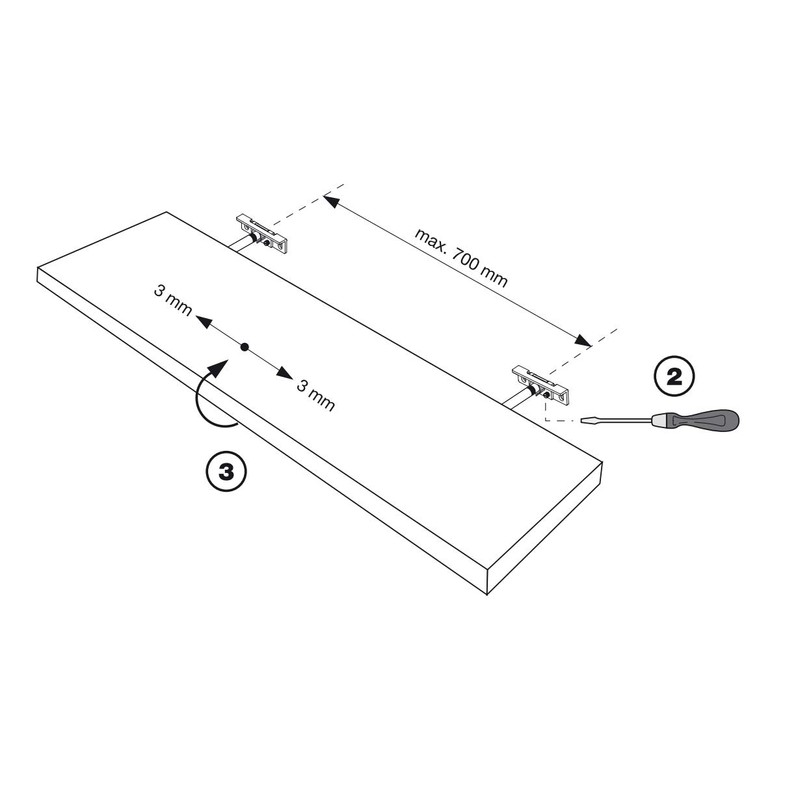 - Shelf bracket with sides, height and tilt adjustment via slotted holes in the mounting plate