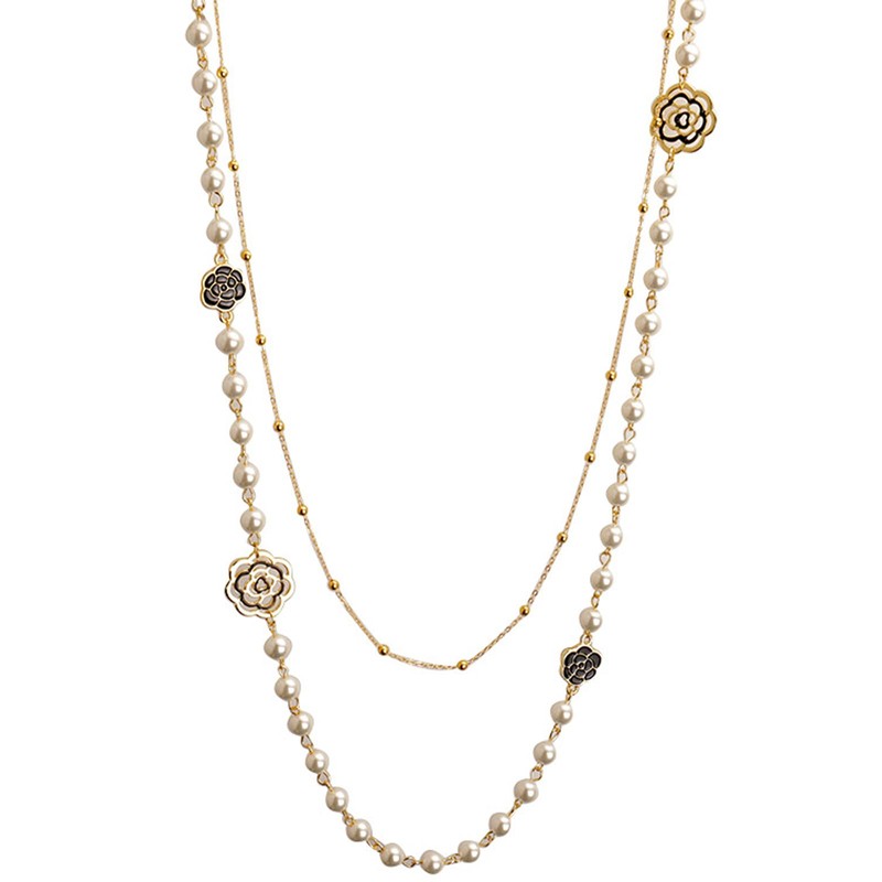 Designer Imitation Pearl Neckalce Camellia Flower Long Double Stranded Necklace Jewelry for Woman Pearl Jewellery