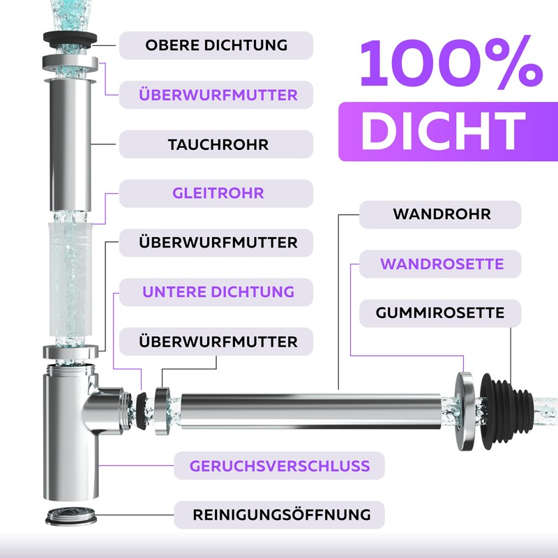- 100% universal fit – tube siphon fits all standard drain fitting hand basins thanks to the standardised 1¼ installation size. Connection to the water pipe is included. Real space-saving siphon!