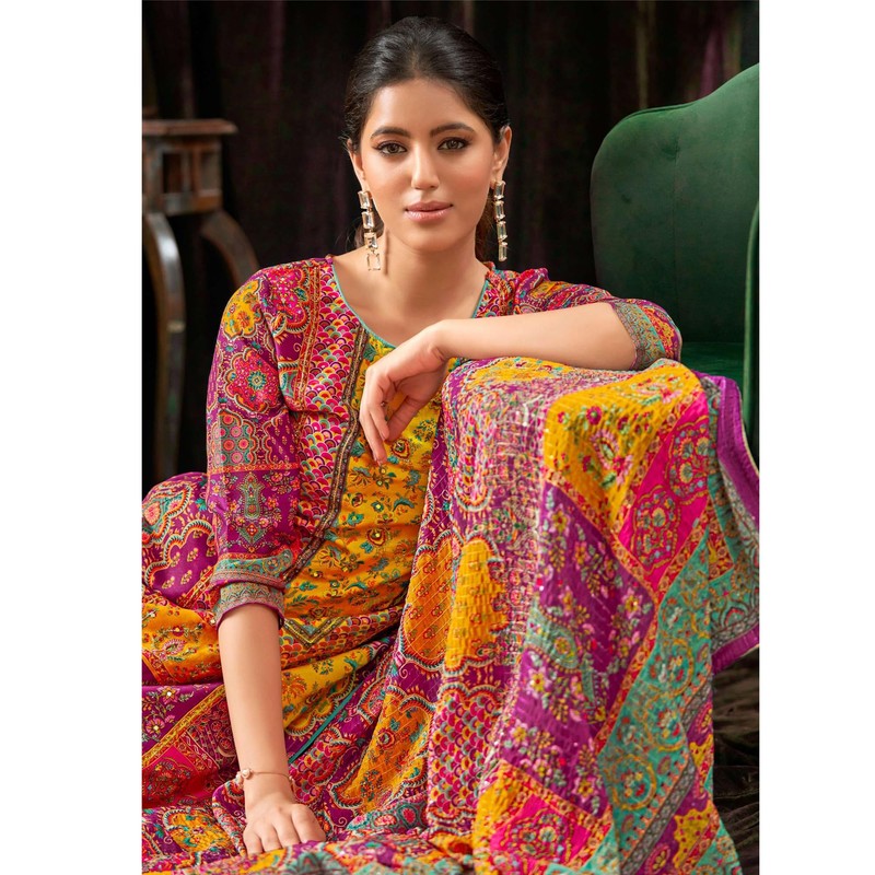 - Description :- Top : Pure Maslin Designer Digital Print With Aari Mirror Hand Work || Bottom : Pure Reyon Solid || Dupatta : Pure Maslin Pattern Designer Box Pallu Dupatta With Four Side Lace* || Work :- Embroidery Work & digital printed work || Size :- Max up to 54" Inches || Style :- Salwar Kameez Plazzo Pant Suits || Type :- Ready to Wear ||