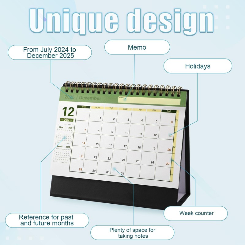 • Special Design: The elements contained in this standing flip desk calendar are very complete and thoughtful. It covers from July 2024 to December 2025, provides references for past and future months, day counters for the current year, holiday markers, and enough space for recording, meeting your various needs.