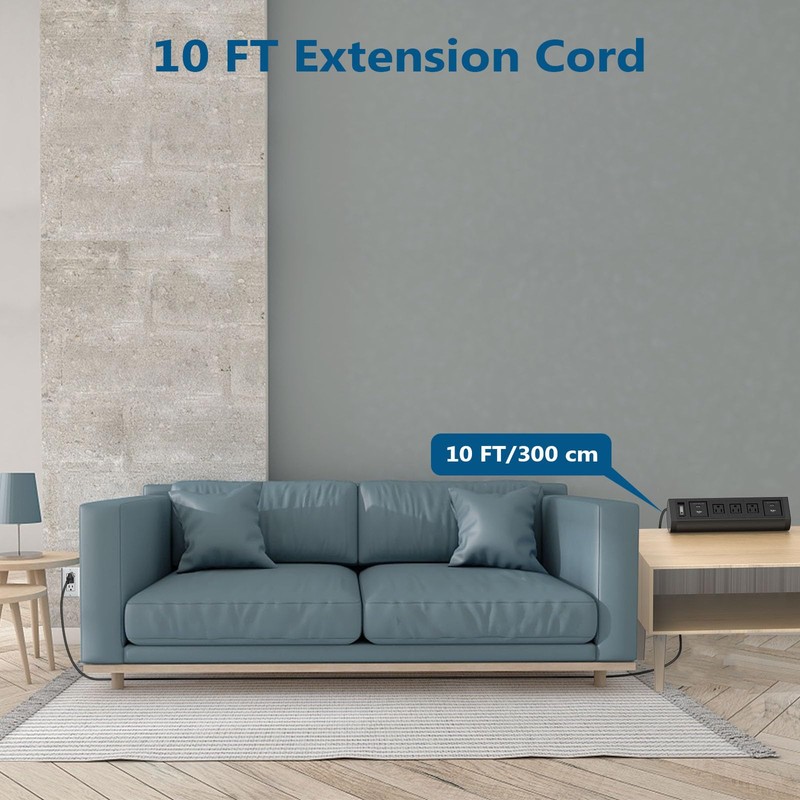 • 7 In 1 Desktop Power Strip - This Desk Mount power strip has 3 widely spaced outlets to plug desk electronic accessories large plugs(10A,240V,2400W), and comes with 2*USB-C ports + 2*USB-A ports; Connected with 10ft extension power cord, easily solve your electricity troubles.