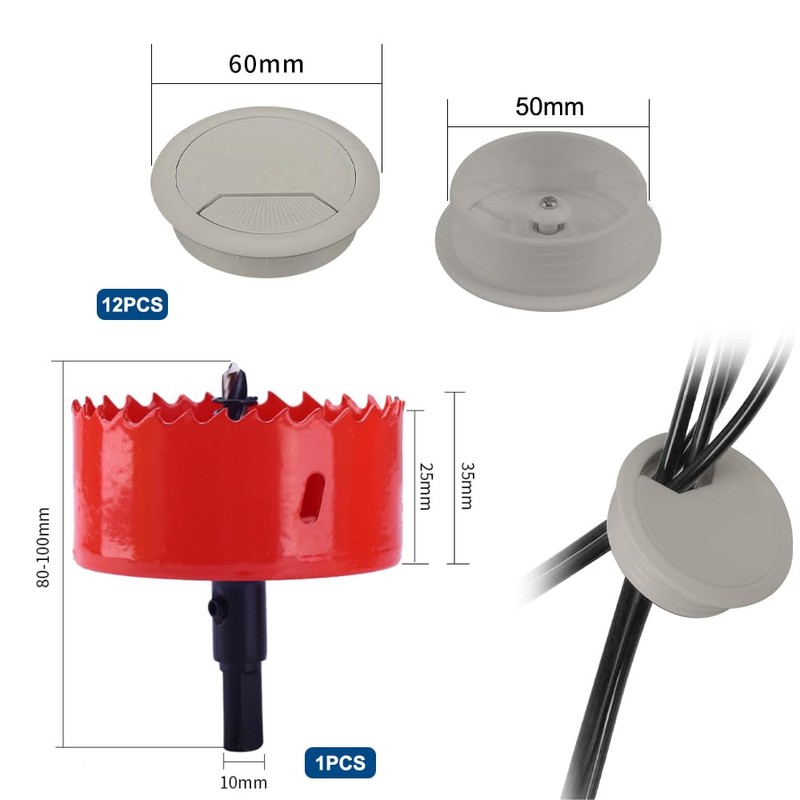 - 🛍️Paket Includes: You will receive 12 Desk table cable grommet and 1 hole saw. The cable grommet has a diameter and the hole saw hole is 60 mm