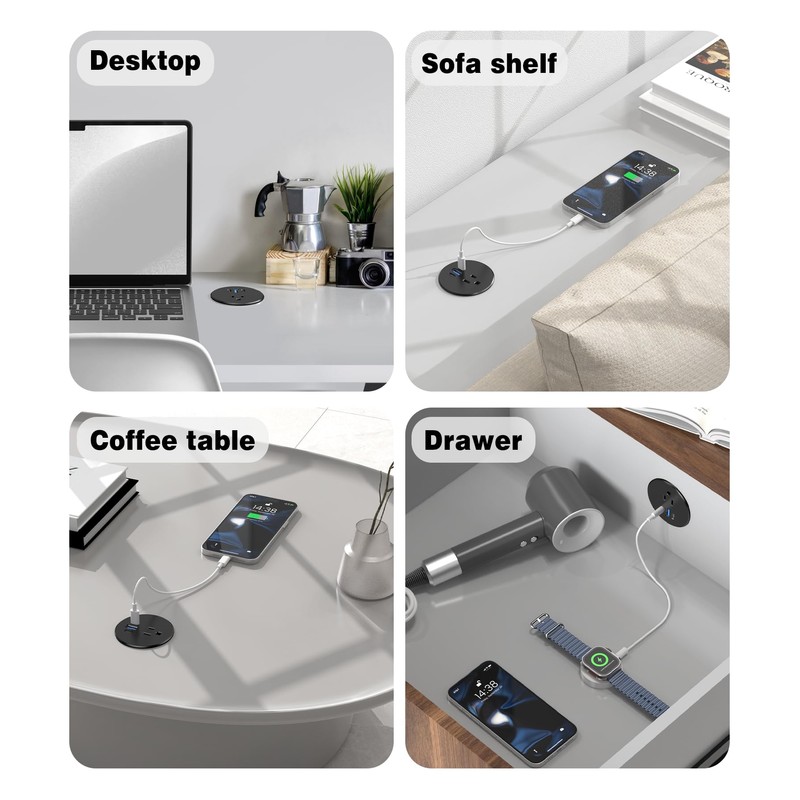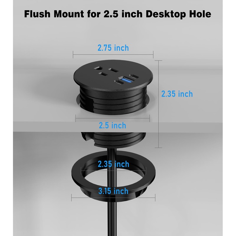 - Fits Standard 2.5 Inch Cable Holes: Suitable for all types of desks and countertops, including coffee tables and workspaces. The compact design ensures flexible installation, keep your workspace neat and organized by getting rid of bulky adapters and tangled cords. Perfect for charging multiple devices in homes, offices, or schools.