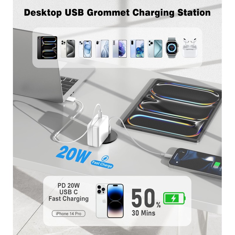 - 2.5in Desktop Grommet Outlet: 1 fast charging QC3.0 20W Max USB-A port and 2 PD3.0 20W Max USB-C ports. Come with 1 AC Outlets. Great addition to nightstand or furniture table.