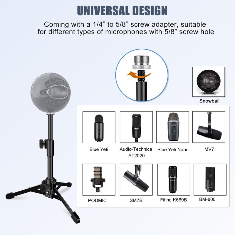 - WIDE COMPATIBILITY: With a 1/4" to 5/8" adapter, the desk mic stand is compatible with Blue Yeti, Yeti Pro, Snowball, for HyperX QuadCast, SoloCast, Fifine, AT2020, for Razer Seiren X, and other microphones. The package also comes with a mic clip with a max diameter of 1.2", compatible with dynamic microphones such as for Shure SM58, SM48, PGA48, for Samson Q2U, and etc.