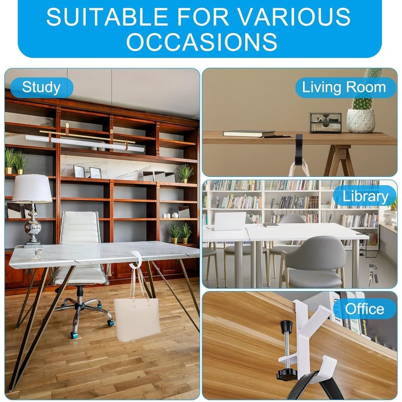 - Multi-function: The desk mount bag holder for a table can be used to hang bags, and you can also hang headphones, hats, umbrellas, and other daily necessities on kitchen counters, bookshelves, and entry cabinets they are all perfect.