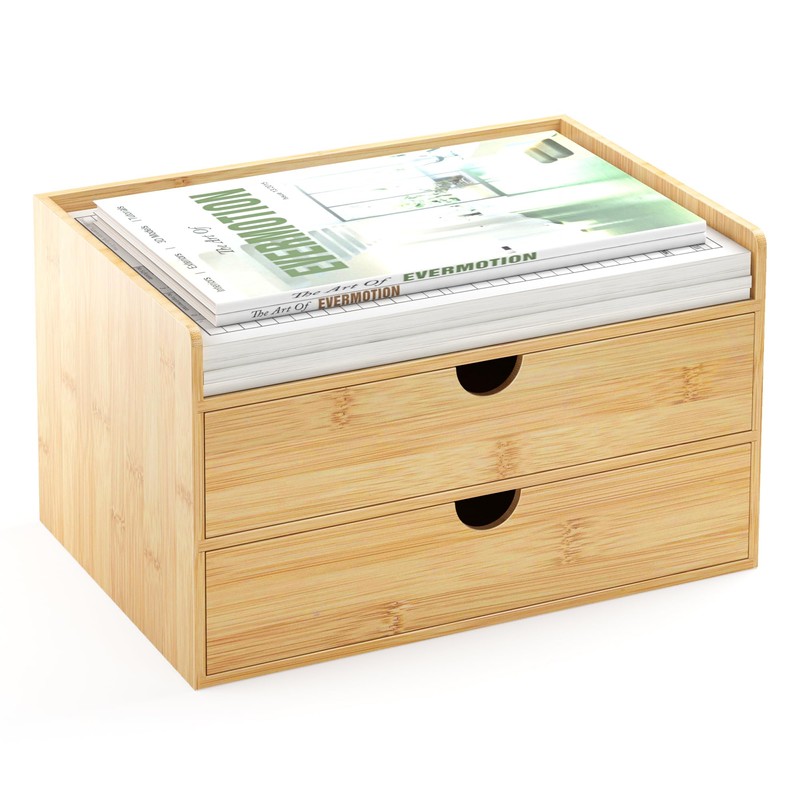 Desk Organizer with Drawers - Bamboo Desktop Organizer Storage | Wood Desk Drawers Organizer for Bills, Office Supplies, Cosmetics, Seals No Assembly Required (2 Drawer)