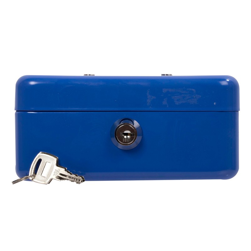 Desk Tech Heavy-Duty Metal Cash Box with Lock, 6-Slot Removable Tray, Portable Safe Box for Office Desk, School, Small Business, and Yard Sale, 6" L x 2.5" H x 4.5" W, Blue