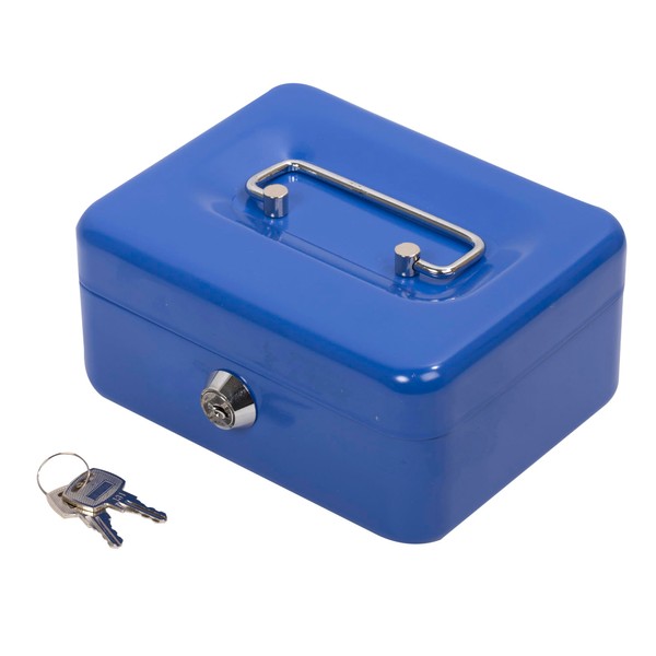 Desk Tech Heavy-Duty Metal Cash Box with Lock, 6-Slot Removable Tray, Portable Safe Box for Office Desk, School, Small Business, and Yard Sale, 6" L x 2.5" H x 4.5" W, Blue