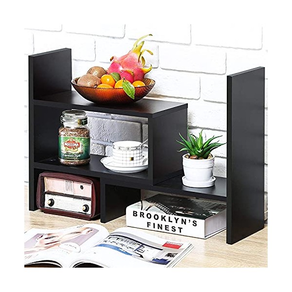 • EASY TO ASSEMBLE: Wood desktop bookshelf is easy and simple for you to install on your own. Screws are included. Dimensions (inches): L12.59(can extends to 24.01) X W6.69 X 13.77H.