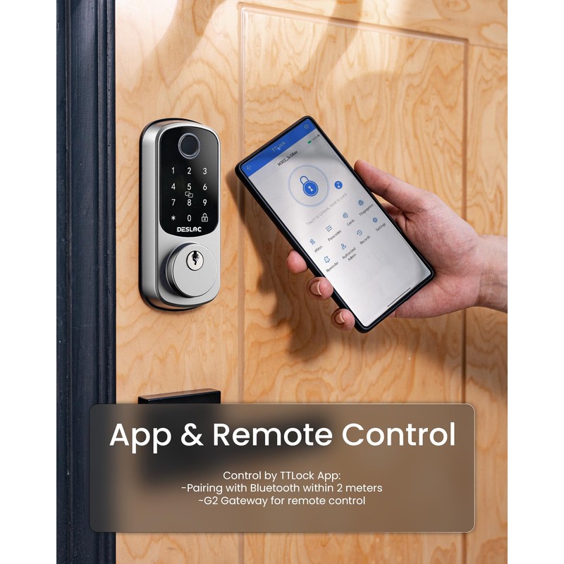 - ๐๐ฉ๐ฉ & ๐๐๐ฆ๐จ๐ญ๐ ๐๐จ๐ง๐ญ๐ซ๐จ๐ฅ: Pair with Bluetooth for TTLock App control within the distance of 2 meters. Upgrade with G2 Gateway (sold separately) for remote control. Smart Lock B200 allows generate temporary access codes in scheduled time for friends or guests.