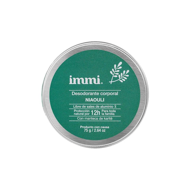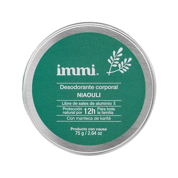 IMMI es un desodorante natural en forma de crema, elaborado con ingredientes que inhiben la bacteria que causa el mal olor y absorben la humedad. Brinda protección de 12 horas y es libre de sales de aluminio y parabenos. Su consistencia cremosa facilita la aplicación y absorción.