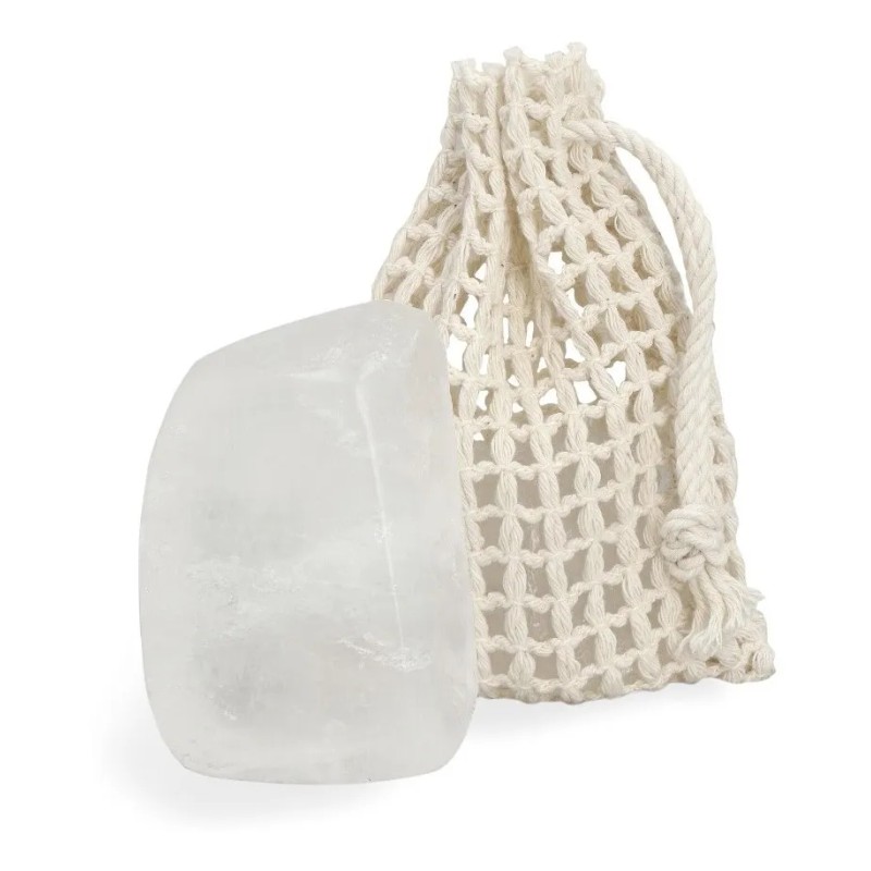 El Desodorante de Piedra de Alumbre está compuesto por un mineral natural de alumbre, el cual es altamente hidrosoluble, lo que significa que se diluye rápidamente en agua, por eso es necesario mojarlo antes de usarlo.