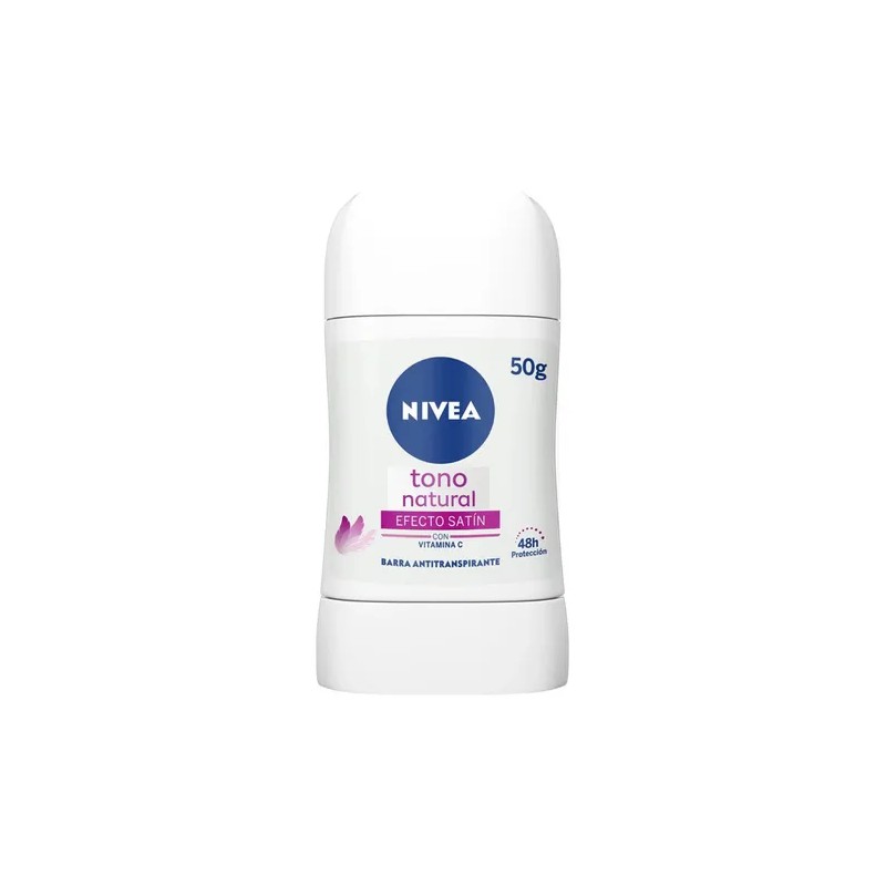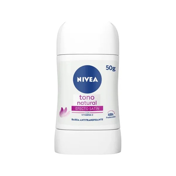 Descubre el Desodorante Nivea Tono Natural Efecto Satín en barra, tu aliado perfecto para sentirte fresca y segura todo el día. En un práctico formato de 50g, este desodorante no solo te brinda 48 horas de protección antitranspirante, sino que también ayuda a restaurar el tono natural de tus axilas gracias a sus ingredientes especiales. 🌸 Su fórmula con efecto satín deja tu piel increíblemente suave y tersa, sin irritaciones. ¡Siéntete cómoda y confiada con axilas visiblemente más uniformes y cuidadas!
